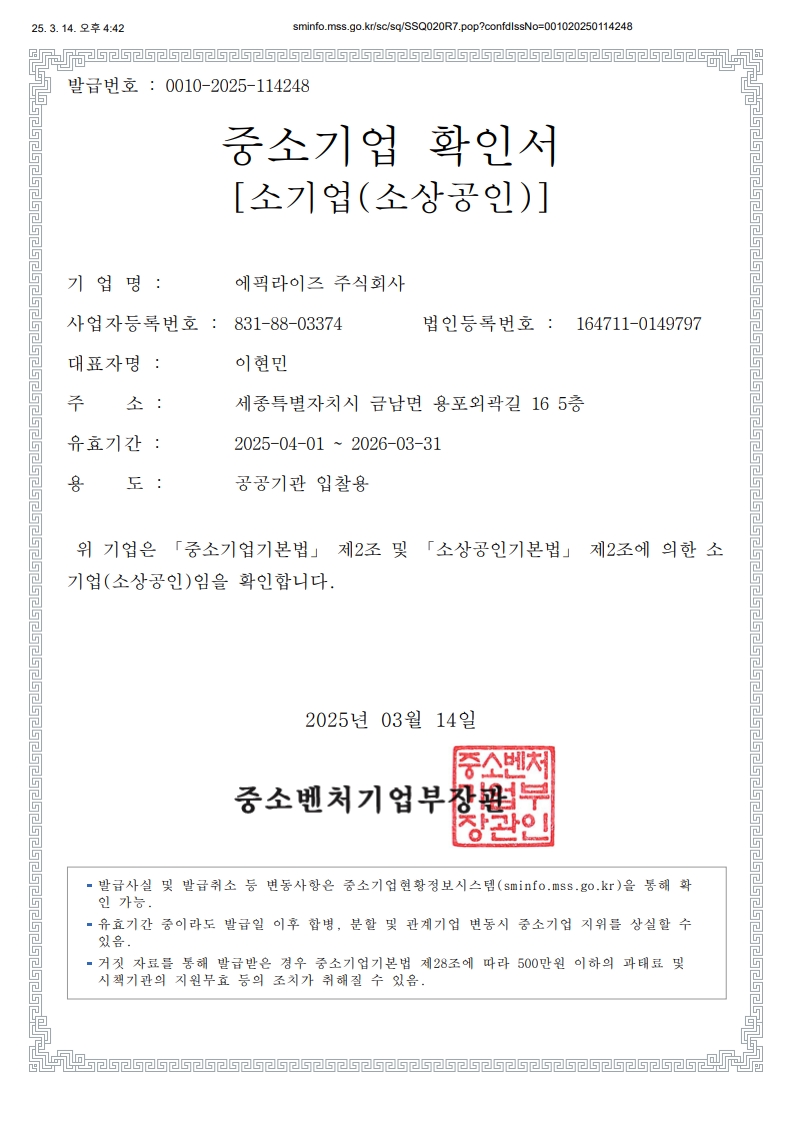 중소기업확인서 > LICENSE 에픽라이즈㈜