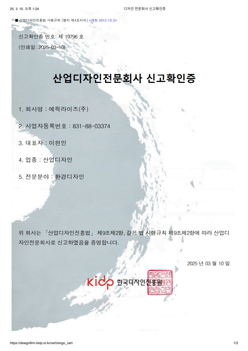산업디자인전문회사 신고증 > LICENSE 에픽라이즈㈜